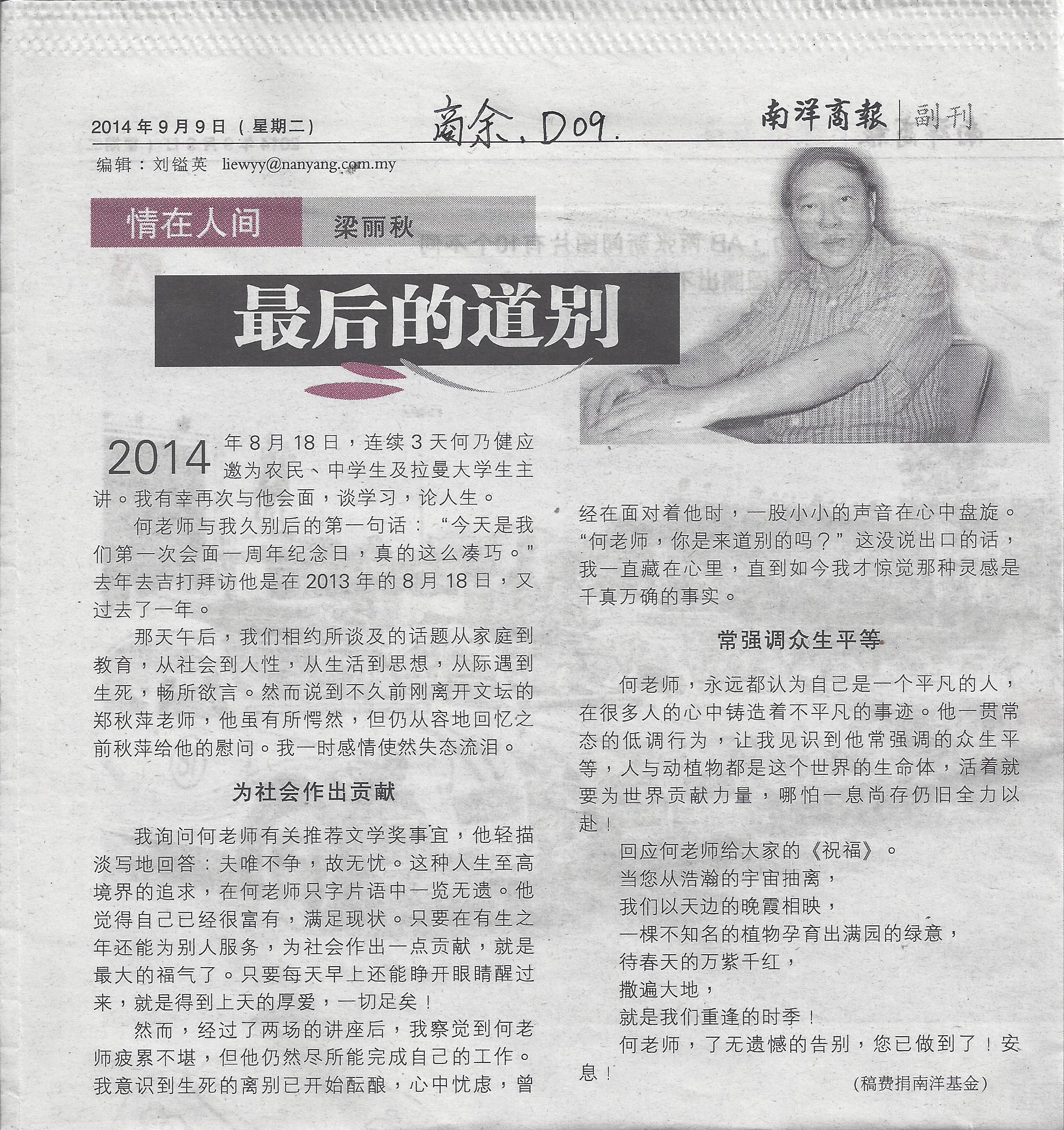 然而,经过了两场的讲座后,我察觉到何老师的疲累不堪,但他仍然尽所能完成自己的工作。我意识到生死的离别已开始酝酿,心中忧虑,曾经在面对着他时,一股小小的声音在心中盘旋。“何老师,你是来道别的吗?”这没说出口的话,我一直藏在心里,直到如今我才惊觉那种灵感是千真万确的事实。
