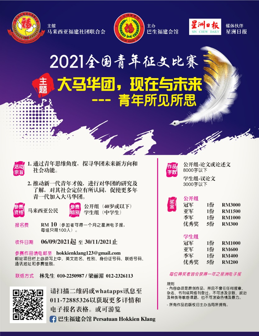 请扫描二维码或 WhatsApp讯息至011-72885326以获取更多详情和电子报名表格。或可游览巴生福建会馆 Persatuan Hokkien Klang(Facebook)