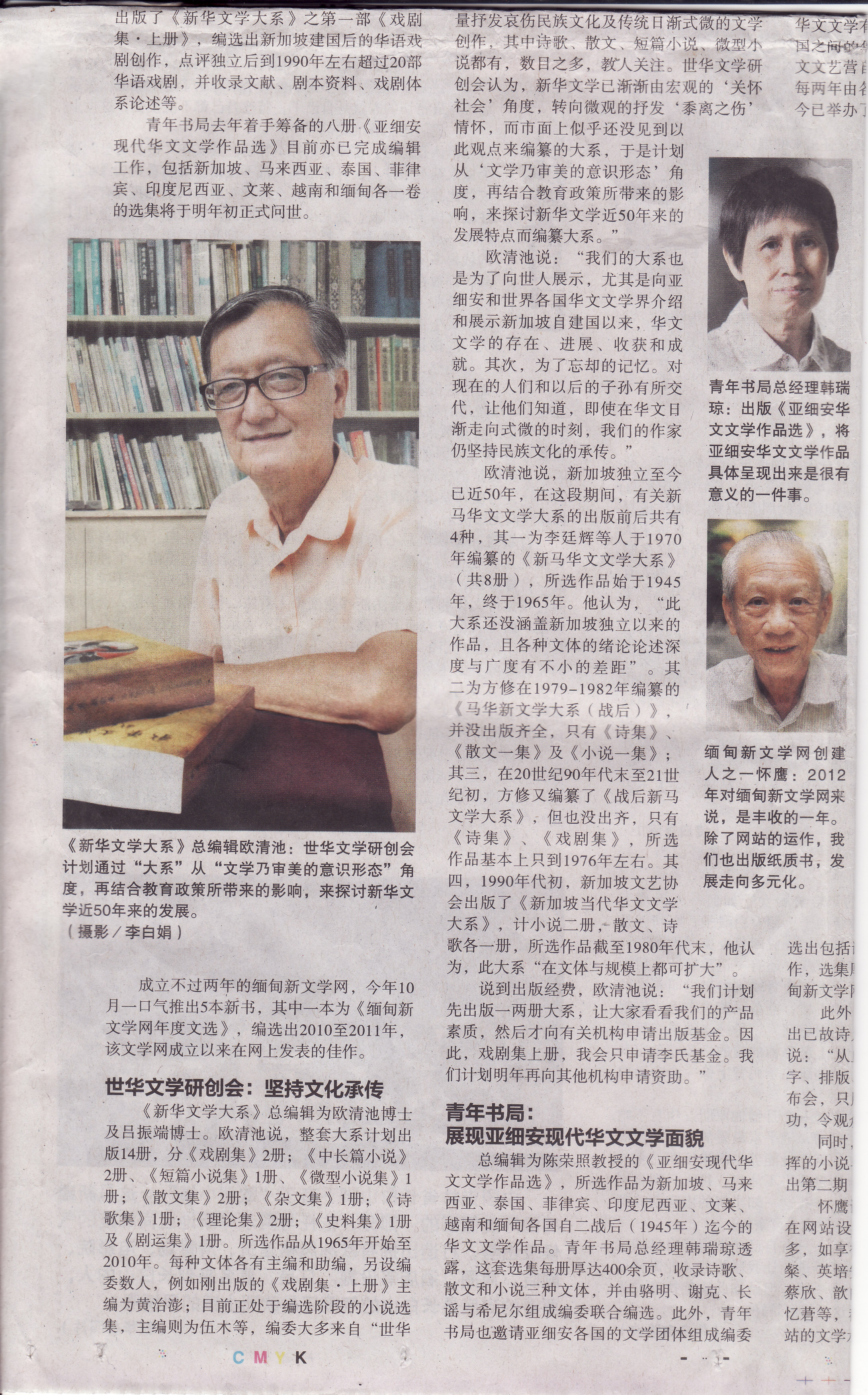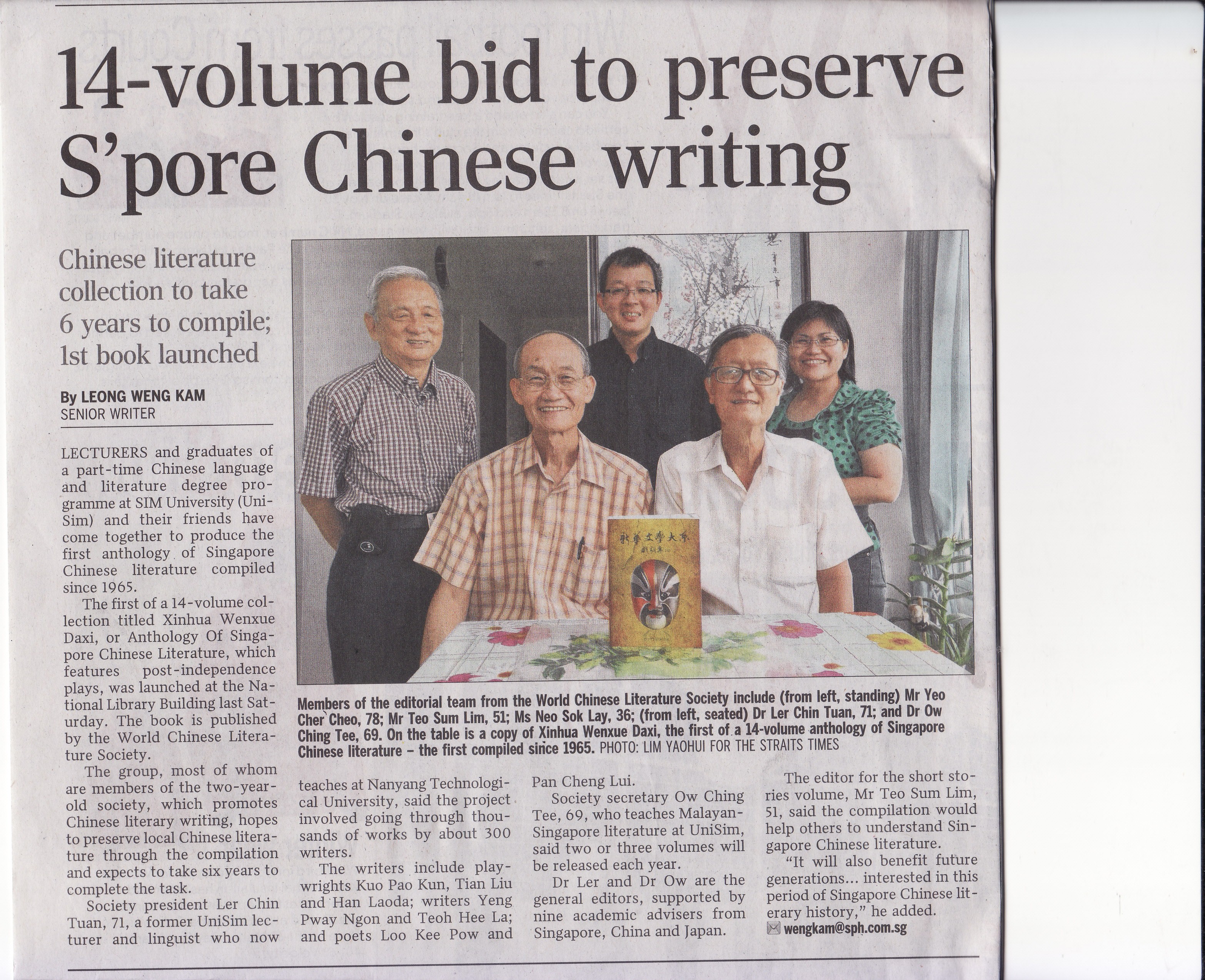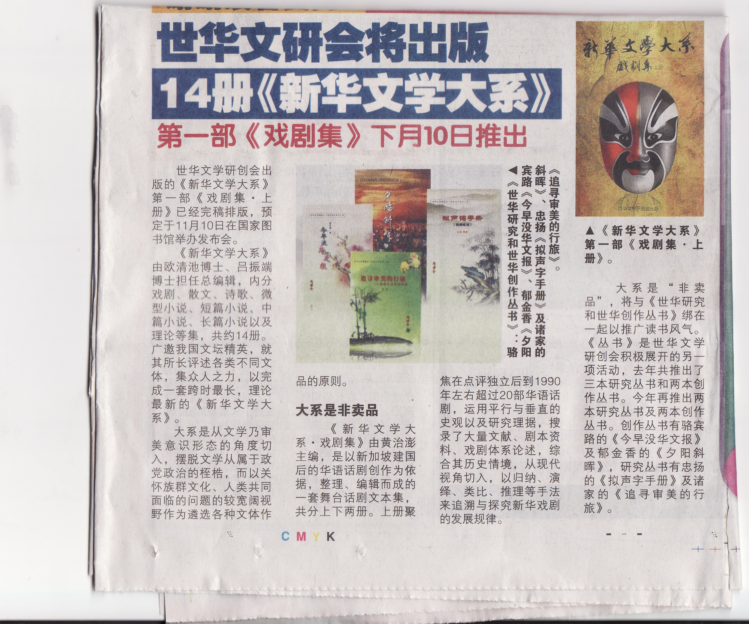 《新华文学大系》由欧清池博士、吕振端博士担任总编辑,内分戏剧、散文、诗歌、微型小说、短篇小说、中篇小说、长篇小说以及理论等集,共约14册。世华文学研创会已于2012年11月10日在新加坡国家图书馆举办《新华文学大系》第一部《戏剧集·上册》的发布会。《新华文学大系·戏剧集》由黄治澎主编,此大系是非卖品,多赠送给一些大学图书馆及相关研究机构。