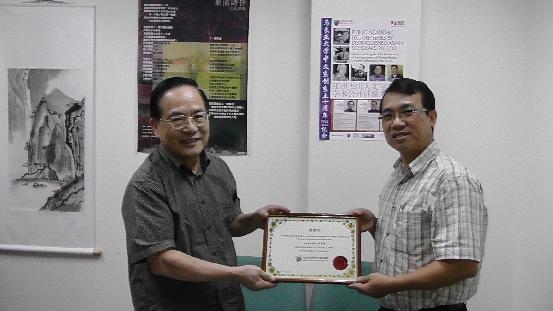 南方大学学院马华文学馆藏书丰富,是研究马华文学的重要资料库。2012年9月5日,马电图同仁初次拜访南方大学学院,洽谈马华图书资源共享的合作事项,祝家华校长同意成为马华文学电子图书馆的参与单位。此行,许文荣馆长颁发感谢状给南方大学学院。马华文学馆、马华文学电子图书馆都以分享文学资料为宗旨,相信双方的合作将有助于马华文学更好的面向世界。作为参与单位,南方大学学院将向马电图提供专业指导以及其他方面的支援,与此同时,该大学可把马电图网站纳入校内的电子资源(online database),以更方便师生阅览与使用,达到互惠互利。
